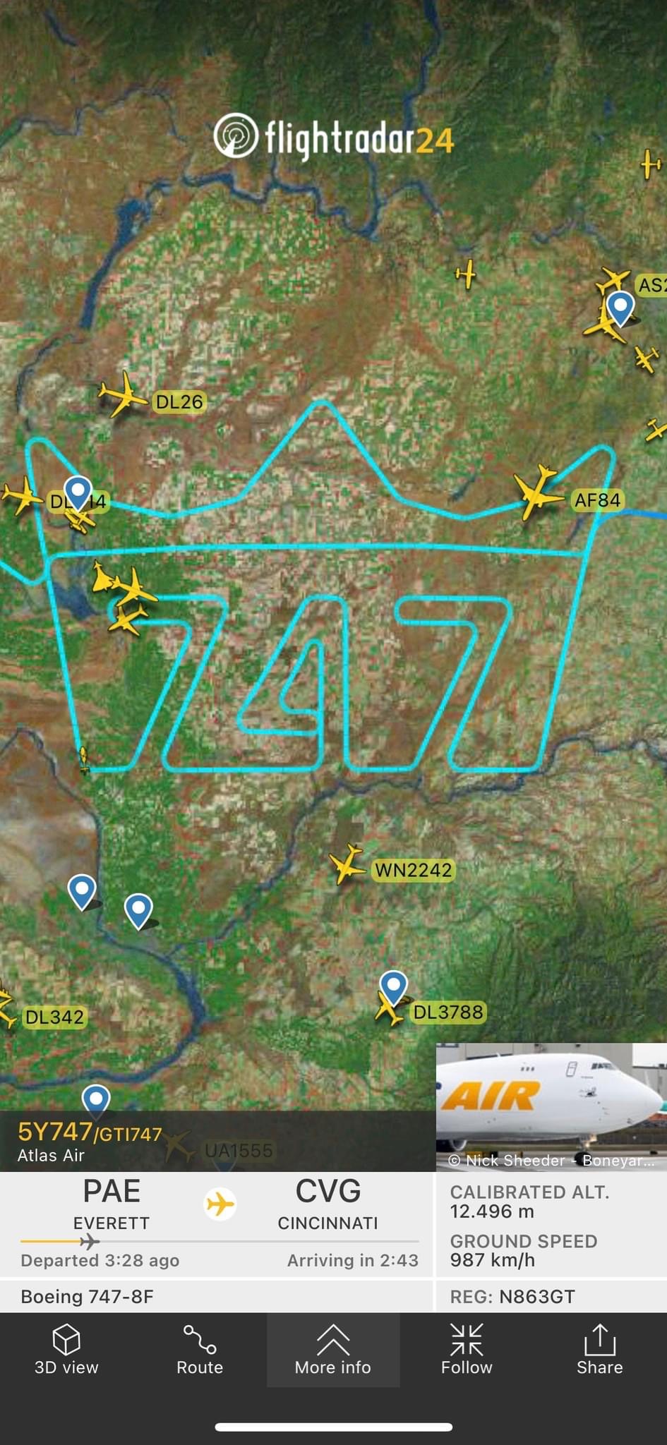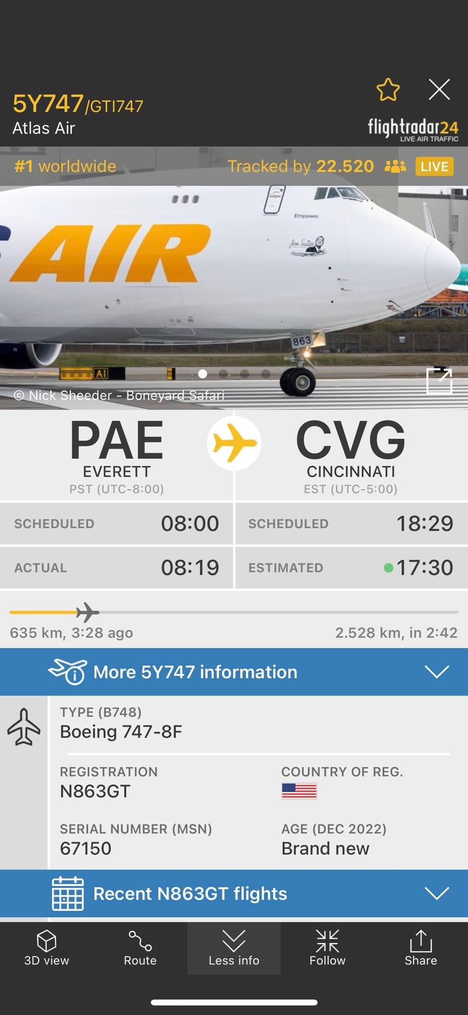 N863GT môžeme nazvať aj poslednou Kráľovnou nebies. B747-8F sériovej výroby 1547 bol posledným vyrobeným Jumbom počas 55 rokov ich produkcie. Dokončením jeho produkcie sa zavreli brány produkčnej linky pre B747 v Everette. Výrobca však usporiadal rozlúčkovú oslavu hodnú majestnátnosti typu – pri hangári sa zišli súčasní a bývalí zamestnanci, ako aj predstavitelia aeroliniek a významné osobnosti. Lietadlo pri svojom rozlúčkovom odlete a dodávacom lete pre spoločnosť Atlas Air nakreslilo ikonický 747 vzorec. Ešte dodáme, že najnovšia verzia B747 má dolet 8010 km (4352 námorných míľ), nákladnú kapacitu 133 ton a pojme 34 nákladných paliet na hlavnej palube.